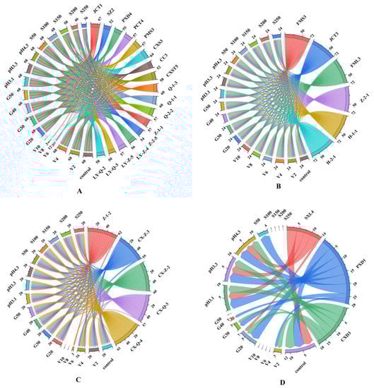 Chordal diagram: the tolerance of different genera of yeast under selective pressures. (A) Hanseniaspora genus; (B) Saccharomyces genus; (C) Metschnikowia genus; (D) Rhodotorula genus. V2–V10: 2–10% concentrations of ethanol; G20–G50: 20–50% concentrations of glucose; S50–S250: 50–250 mg/L concentrations of free SO2. The different colours in the figure correspond to different yeasts and pressure conditions. The left side of the chordal diagram presents the scores of different yeasts under different pressure conditions, and the right side presents the total score of tolerance of different strains under different pressure conditions. Detailed data can be found in Table S1.