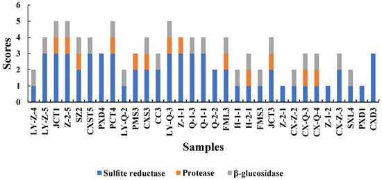 The aroma produced by yeast during fermentation is related to enzymes []. To improve the quality of wine, we screened yeasts with high-yield β-glucosidase and protease and low-yield H2S for winemaking. All enzymatic activity scores are shown in Figure 2.