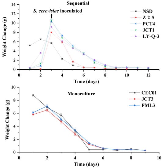 Fermentation rate of sequential and monoculture fermentation. Weight change is defined as the difference of weight between two adjacent days.