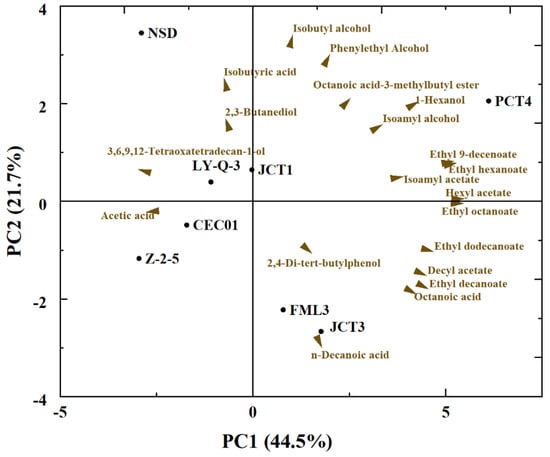 Principal component analysis (PCA) visualizing the relationships among yeasts and volatile compounds for wines.