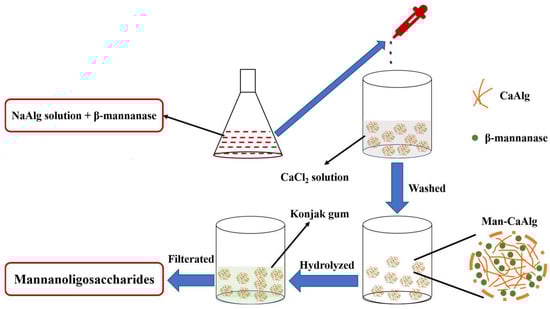 Various factors should be considered when using immobilized enzymes in industry, such as the selection of carrier materials that affect the efficiency and stability of the immobilized enzyme, which depends on the method of immobilization and the properties of the enzyme [20]. In addition, an immobilized enzyme and its carrier must be approved by the local Food and Drug Administration (FDA) before they can be used in the local food industry. Therefore, sodium alginate (NaAlg), a kind of natural polysaccharide, is an excellent carrier that meets the above conditions. It is widely used by immobilizers due to its easy availability, low cost, good biocompatibility, and ease of preparation [21]. In this study, biodegradable, inexpensive, and safe alginate and CaCl2 were used to immobilize β-mannanase, and the optimal immobilization conditions on the immobilized enzyme were determined. The properties of the immobilized enzyme and free enzyme were characterized. The enzyme demonstrated improved stability and activity after immobilization. MOSs were prepared from konjac gum by Man-CaAlg, and the yield of the MOSs was investigated (Figure 1). The ultimate aim of this research is to provide a simple, safe, and effective preparation method to reduce costs and increase yield.