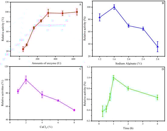 As shown in Figure 2A, with the increase in enzyme addition, the relative activity of Man-CaAlg continued to increase until the enzyme addition exceeded 320 U, and the enzyme activity did not increase significantly. When the amount of added enzyme was less than 320 U, since the NaAlg microspheres had sufficient capacity to intercalate β-mannanase, the activity of Man-CaAlg rapidly increased. When the amount of enzyme added was more than 320 U, the Man-CaAlg activity increased slowly, which may be caused by NaAlg hindering the binding of β-mannanase to the substrate (Figure 2A). Another reason probably was that the space in NaAlg that can encapsulate β-mannanase was limited. If the amount of β-mannanase is increased, it will only leak out and cannot be fixed in NaAlg microspheres [26]. Therefore, the enzyme addition of 320 U was selected for subsequent assay.