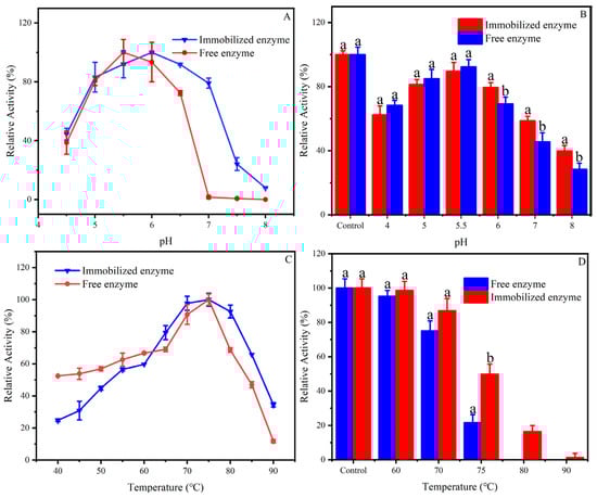 The activity and stability of enzymes at different temperatures and pHs are of great significance for industrial applications. In this study, the effect of different pH values (4–8) on the relative activity in free β-mannanase and Man-CaAlg was evaluated. As can be seen from Figure 3A, with the increase in the pH value, the relative activity of Man-CaAlg and free β-mannanase showed a trend of increasing first and then decreasing. When the pH value was lower than 5.5, the relative activity of free β-mannanase gradually increased, and when the pH value was higher than 5.5, the relative activity of free β-mannanase gradually decreased. Similarly, when the pH value was lower than 6.0, the relative activity of Man-CaAlg gradually increased, and when the pH value was higher than 6.0, the relative activity of Man-CaAlg gradually decreased (Figure 3A). Therefore, it can be seen from Figure 3A that the optimum pH of Man-CaAlg shifted from 5.5 which was the optimum for free β-mannanase to 6.0. Moreover, when the pH was more than 5.5, the Man-CaAlg showed better activity, which was similar to the previous report (Figure 3A) [18]. When the pH value was 7, free β-mannanase was inactivated, while Man-CaAlg still maintained 79.1% relative activity.
