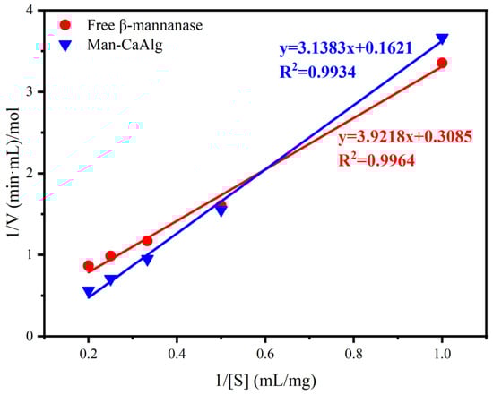The quality of immobilization was estimated by measuring changes in the kinetic parameters. The rate of reaction and affinity of Man-CaAlg or free β-mannanase towards the substrate (LBG) will be indicated by Vmax and Km, respectively. The Km and Vmax of the free β-mannanase and Man-CaAlg were evaluated by using the substrate LBG at different concentrations. Figure 4 shows the Lineweaver–Burk plots of free β-mannanase and Man-CaAlg. The Km value was found to be 10.17 and 19.36 mg/mL for the free β-mannanase and Man-CaAlg, respectively. The higher the Km value of Man-CaAlg, the lower the affinity of Man-CaAlg to the substrate, which may be caused by the increase in the steric hindrance of the active site and the loss of flexibility of the enzyme necessary for substrate binding [32]. Previous studies have also shown that the affinity of most immobilized enzymes to substrates will be weakened [33]. Moreover, the Vmax of Man-CaAlg increased from 3.24 to 6.17, which may be due to improper conformation of the enzyme in the CaAlg gel beads. Previous studies also report that the Km and Vmax of the free enzyme (LXy) were lower than the immobilized enzyme (LXy-NaAlg), suggesting that the free enzyme has a high affinity to the substrate [34]. In addition, the enhancement of the affinity of the immobilized enzyme and a reduction in the reaction rate were also commonly reported [35,36,37]. These results clearly indicate that the immobilization of β-mannanase on CaAlg gel beads reduces the affinity between the β-mannanase and the substrate, which is due to a reduction in the contact area between the substrate and the β-mannanase.