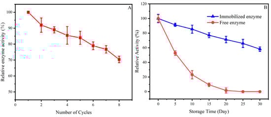 The reusability of immobilized enzymes is the top priority in industrial applications due to its influence on operational stability [38]. The results of Man-CaAlg activity repeatedly measured eight times under the optimal conditions are shown in Figure 5A. As the number of cycles increased, the activity of Man-CaAlg gradually decreased. However, Man CaAlg maintained activity of 70.34% and good reusability after 8 cycles. Similar results were obtained for other enzymes immobilized on sodium alginate [39,40]. This may be due to enzyme denaturation caused by repeated heating [30]. Moreover, according to Yang et al. (2014)’s report, the reusability of immobilized Candida rugosa Lipase (CRL) is better than that of immobilized Brassica oleracea Chlorophyllase 1 (BoCLH1), even though their carriers are the same [41]. Therefore, the reusability of the immobilized enzyme is also related to the property of the enzyme itself.