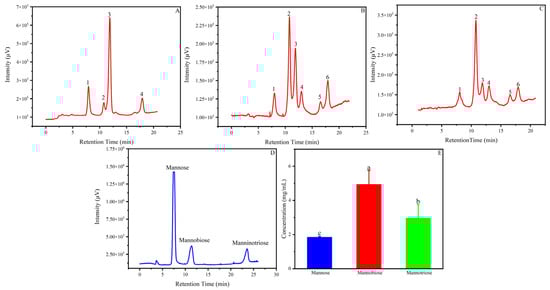 End product analysis of KGM hydrolysis by Man-CaAlg. HPLC of No. 1 KGM hydrolysate. Peaks 1, 2, 3, and 4 represent mannose, mannobiose, mannobiose and mannotriose, respectively (A). HPLC of No. 2 KGM hydrolysate. Peaks 1, 2, 3, 4, 5, and 6 represented mannose, mannobiose, mannobiose, mannobiose, mannotriose, and mannotriose (B). HPLC of No. 3 KGM hydrolysate. Peaks 1, 2, 3, 4, 5, and 6 represented mannose, mannobiose, mannobiose, mannobiose, mannotriose, and mannotriose (C). HPLC of standards (mannose, mannobiose, and mannotriose) (D). Yield of MOSs (E). The error bars are described as the average ± standard deviation (SD). The bars followed by different lowercase letters were significantly different at p < 0.05 using ANOVA.