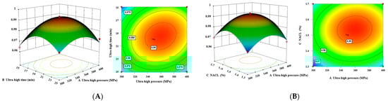 In order to more intuitively reflect the effect of the interaction between the four factors of UHP pressure (A), UHP time (B), NaCl addition (C), and compound phosphate addition (D) on the composite value Y, the response surface and contour plots of the relationship between each of the two factors and the composite value were plotted using Design Expert 13.0 software (Figure 5). The deeper the surface of the response surface and the closer the shape of the contour lines to an ellipse, the more significant the effect of the interaction between independent variables on the response value. Compared to the other plots, the contour lines of the AB and AD interaction terms (Figure 5A,C) are elliptical and densely distributed, and the surface is steeper, indicating that the interactions between UHP pressure and UHP time and compound phosphate, respectively, are obvious and have more significant effects on composite values (p < 0.01), which are consistent with what is described in Table 4.