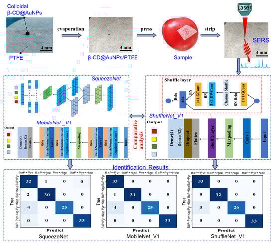 To achieve rapid, intelligent, and automated analysis, SERS spectra can be combined with deep learning (DL) methods to build a determination model [28,29]. In particular, lightweight DL networks—such as SqueezeNet, Xception, MobileNet, and ShuffleNet developed based on the representative convolutional neural network (CNN)—have been widely used because of small parameters, low computational overhead, and high precision, showing a higher specificity and sensitivity compared to typical chemometric analysis [30,31,32,33]. For example, Weng et al. [34] used SqueezeNet to develop regression models for the analysis of chlormequat chloride and acephate; excellent performance was obtained with coefficients of determination (R2) of 0.9836 and 0.9826 and root-mean-square errors (RMSEs) of 0.49 and 4.08, respectively. Wang et al. [35] proposed a novel regression model, a lightweight one-dimensional CNN, for predicting the nicotine content in tobacco leaves with R2 and RMSE values of 0.95 and 0.14, respectively. These results demonstrated that lightweight networks were suitable for the rapid, accurate analysis of SERS spectra. Consequently, SqueezeNet, MobileNet, and ShuffleNet were used to build classification models for the analysis of various PAH residues on fruit and vegetable surfaces.