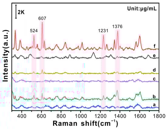 SERS spectra of 10 μg/mL BaP detected based on different flexible substrates: (a) β-CD@AuNP/PDMS, (b) 10 μg/mL BaP detected by β-CD@AuNP/PDMS; (c) β-CD@AuNP/tape, (d) 10 μg/mL BaP detected by β-CD@AuNP/tape; (e) β-CD@AuNP/PTFE, (f) 10 μg/mL BaP detected by β-CD@AuNP/PTFE.