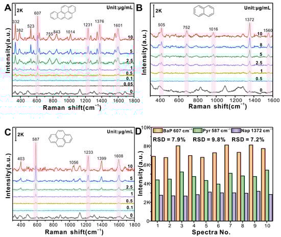 Detection of PAHs by β-CD@AuNP/PTFE; SERS spectra of (A) BaP, (B) Nap, and (C) Pyr standard samples, insets showing their molecular structures; (D) RSD values of characteristic peak intensities of 10 μg/mL BaP, Pyr, and Nap at 607, 587, and 1372 cm−1, respectively.