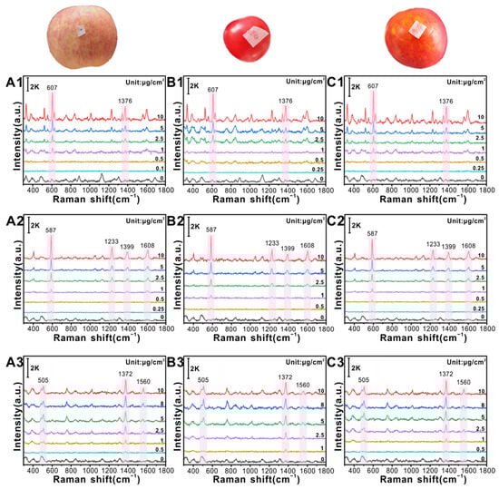 The SERS spectra of the spiked samples prepared by spraying BaP, Pyr, and Nap onto the surfaces of apples, tomatoes, and peaches are shown in Figure 4. When BaP concentrations on the surfaces of apples (Figure 4(A1)), tomatoes (Figure 4(B1)) and peaches (Figure 4(C1)) are as low as 0.1, 0.25, and 0.25 μg/cm2, respectively, there is still a weak SERS signal at 607 cm−1, especially at 0.25 μg/cm2, which can be attributed to the C-C and C-H bending vibration modes. The characteristic peaks at 587 cm−1 and 1233 cm−1 can still be observed at Pyr concentrations as low as 0.25, 0.5, and 0.25 μg/cm2 on the surfaces of apples (Figure 4(A2)), tomatoes (Figure 4(B2)), and peaches (Figure 4(C2)), corresponding to C-C stretching and C-H bending vibration modes. The difference in spectral signal intensity between the different peels may be related to the roughness and chemical composition of the peels. When the concentration of Nap on the surface of the apple (Figure 4(A3)), tomato (Figure 4(B3)), and peach (Figure 4(C3)) is as low as 0.5, 1, and 0.5 μg/cm2, respectively, the characteristic peak at 1372 cm−1 has a weak signal, while the signal at 505 cm−1 is almost invisible, which is related to the stretching and bending vibrations of the C-C bond.