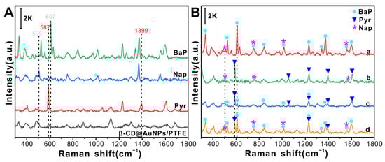 The SERS spectra of various PAHs were obtained using the flexible β-CD@AuNP/PTFE substrate, as shown in Figure 5. Figure 5A shows the SERS spectra of Pyr, Nap, and BaP. It is evident that the characteristic peak of Nap at 505 cm−1 is different from those of Pyr and BaP, and the characteristic peaks of Pyr at 587 and 1399 cm−1 are unique without overlapping. Similarly, the characteristic peak of BaP at 607 cm−1 is unique. These three targets have unique characteristic peaks that provide a basis for the identification of subsequent detection.