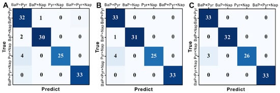 The identification results of the SERS spectra of various PAH residues on fruit and vegetable surfaces using the model constructed with three lightweight networks (SqueezeNet, MobileNet, and ShuffleNet) are shown in Table 1. The results obtained from SqueezeNet, with ACCT, ACCV, and ACCP values of 99.57%, 93.22%, and 94.48%, respectively, were unsatisfactory. Based on the Precision, Recall, and F1-score of the prediction dataset, SqueezeNet is the best at identifying the mixed spectra of BaP + Pyr + Nap, primarily because of the distinct features of the mixed spectra. But the identification of the BaP + Pyr and Pyr + Nap spectra by this network is poor, indicating that the extracted features are not sufficiently rich, which is consistent with the confusion matrix predicted by the SqueezeNet model (Figure 6A). MobileNet performs better than SqueezeNet, with ACCT, ACCV, and ACCP values of 100%, 94.92%, and 96.06%. The Precision, Recall, and F1-score of BaP + Pyr are 100%, 93.94%, and 96.88%, respectively, which are considerably higher than those of SqueezeNet, indicating that MobileNet can effectively capture BaP + Pyr features. Detailed prediction results were obtained from the confusion matrix of the MobileNet model (Figure 6B). Unfortunately, the ability of the network to recognise BaP + Pyr + Nap is low. ShuffleNet achieves the best identification results, with ACCT = 100%, ACCV = 96.61%, and ACCP = 97.63%. These conclusions are also evident from the confusion matrix of the ShuffleNet model shown in Figure 6C, with the identification results of BaP + Pyr + Nap and BaP + Nap by the ShuffleNet model all being correct, and only three Pyr + Nap samples being misclassified as BaP + Pyr. The reason for this result can be found in spectra b and c in Figure 5B, the main characteristic peaks of the spectra of Pyr + Nap and BaP + Pyr being provided by Pyr, and the other weak characteristic peaks from BaP and Nap showing little difference. In general, the results indicate that a lightweight network combined with SERS provides a fast, accurate, and intelligent method for identifying various PAH residues on fruit and vegetable surfaces.