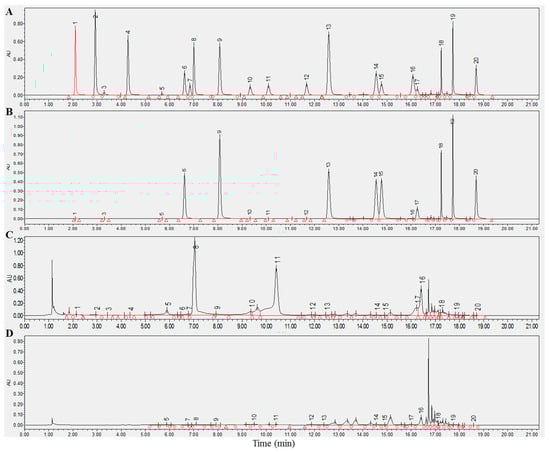 UHPLC-DAD chromatograms of 20 chemical components in tea detected at 280 and 340 nm. (A,B) A chromatogram of the standard at 280 and 340 nm. (C,D) A representative chromatogram of the sample at 280 and 340 nm. Component: 1, gallic acid; 2, gallocatechin; 3, caffeine; 4, theophylline; 5, epgallocatechin; 6, catechin; 7, chlorogenic acid; 8, theobromine; 9, caffeic acid; 10, epicatechin; 11, epigallocatechin gallate; 12, coumaric acid; 13, gallocatechin gallate; 14, ferulic acid; 15 sinapic acid; 16, epicatechin gallate; 17, rutin; 18, myricetin; 19, quercetin; 20, kaempferol.