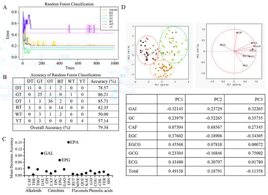 Tea classification based on 19 chemical components using random forests. (A) Random forest classification; (B) accuracy of random forest classification; (C) potential biomarkers identified by random forests. Component: CAF, caffeine; THEO, theophylline; TB, theobromine; GC, (−)-gallocatechin; EGC, (−)-epigallocatechin; C, (+)-catechin; EC, (−)-epicatechin; EGCG, (−)-epigallocatechin gallate; GCG, (−)-gallocatechin gallate; ECG, epicatechin gallate; RUT, rutin; MYR, myricetin; QUE, quercetin; KAE, kaempferol; GA, gallic acid; COU, coumaric acid; CHL, chlorogenic acid; FER, ferulic acid; SIN, sinapic acid. Tea type: BT, black tea; OT, oolong tea; GT, green tea; WT, white tea; DT, dark tea; YT, yellow tea. (D) Principal component analysis (PCA) of 6 types of teas. Black: DT, Red: BT, Green: GT, Yellow: YT, Browm: OT, Gray: WT.