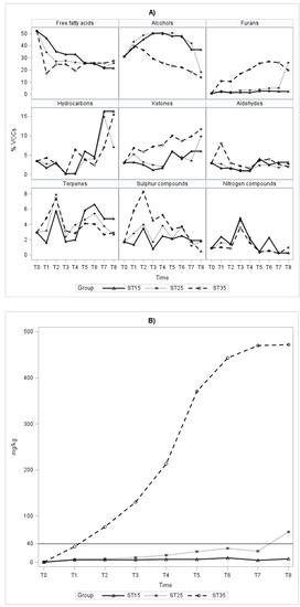 A decreasing trend from ST15 to ST35 was found for free fatty acids (30.44, 26.63, and 24.22%) and nitrogen compounds (2.34, 1.64, and 1.24%). Conversely, an increasing trend is notable for the classes of furans and sulfur compounds, whose average amounts are significantly higher at ST35 than at ST25 and at ST15. Similarly, the highest number of ketones is detected at ST35.