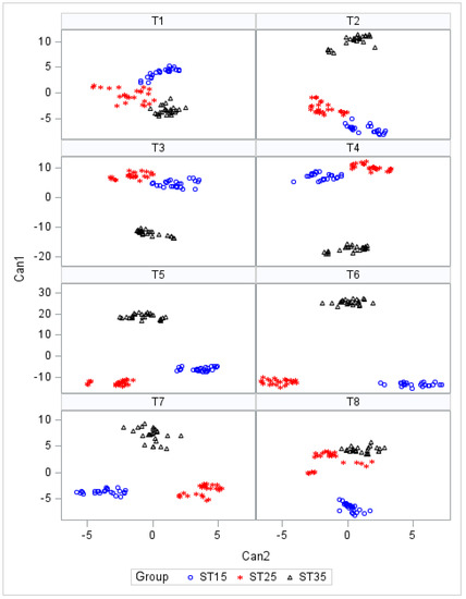 At T1, the honey samples grouped on the basis of the storage temperature but were not clearly separated as in subsequent times. From T2 to T7, the group stored at ST35 was separated from the other two based on the first canonical variable, and at the end of the storage period, it was hardly distinguishable from the group at ST25. The second canonical variable is instead the discriminating factor for the groups at ST15 and ST25 that appear clearly separated starting from T4.