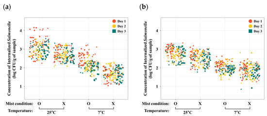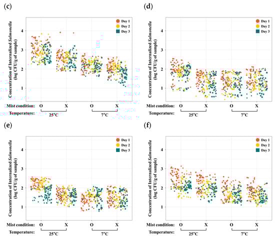 From day 1 to day 3, mean concentrations (log CFU/g of red lettuce) of internalized Salmonella Typhimurium in the red lettuce samples (mean ± SE) were 2.9 ± 0.4 in the 25 °C with mist condition; 2.5 ± 0.4 in the 25 °C without mist condition; 2.2 ± 0.3 in the 7 °C with mist condition; and 2.0 ± 0.3 in the 7 °C without mist condition. We also found significant differences between the groups (ANOVA, F = 5.0, p < 0.05).