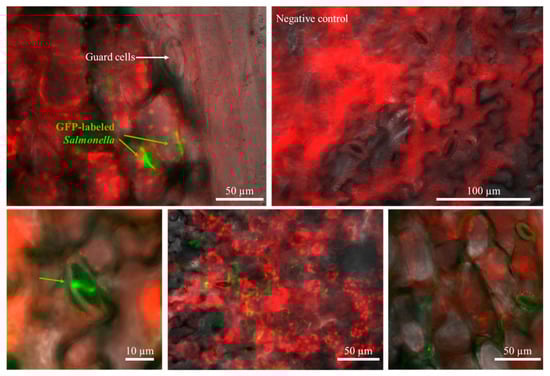To evaluate internalized bacteria only, the surface disinfection steps were conducted and investigated by following our previous study []. After the washing steps with ddH2O, AgNO3, and 80% ethanol solutions, bacteria on the plant surface were not detected (<0 CFU/g of each plant). Concentrations of internalized S. Typhimurium in various fresh produce, including iceberg lettuce, romaine lettuce, red lettuce, green onion, kale, and spinach, were determined and presented in Figure 1 and Table 1. Previous studies revealed the internalization of foodborne pathogens (Campylobacter, E. coli, and Salmonella) into different types of fresh produce [,,]. These studies also focused on the internalization of foodborne pathogens during cultivation. However, our study demonstrated a general pattern of Salmonella internalization into various types of fresh produce during the storage step. In addition, temperature for storage was a critical factor in Salmonella internalization into leaves of each fresh produce. Particularly, under 25 °C with mist condition, the mean concentration of internalized Salmonella in the iceberg lettuce sample was the highest and that in the green onion sample was the lowest (iceberg lettuce > red lettuce > romaine lettuce > spinach > kale > green onion). In addition, the common pattern of the concentration of internalized Salmonella was similar to the group stored at 25 °C with mist conditions. Furthermore, to investigate Salmonella internalization on leaf surface of the fresh produce, a fluorescence microscope was used (Figure 2). From the microscopic images, it is obvious that GFP-labeled Salmonella (green) can internalize in fresh produce. The images showed various statuses of GFP-labeled Salmonella in the iceberg lettuce, such as underneath the stomata in the substomatal and/or intercellular region, around the rim of the stomata, and in the iceberg lettuce.
