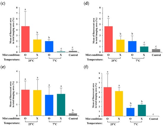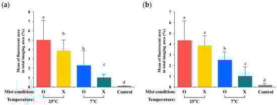 Using the fluorescence microscope with ImageJ software (version 1.52), fluorescent areas (%) of GFP-labeled Salmonella were measured to estimate levels of internalized S. Typhimurium (Figure 2 and Figure 3). The general pattern of fluorescent area (%) was similar to the data generated from the plate counts (CFU), except for the green onion and kale samples. Temperature and mist conditions were important factors in bacterial internalization into fresh produce. The groups stored at 25 °C showed a larger fluorescent area (%) than the groups stored at 7 °C. In addition, mist treatment facilitated bacterial internalization into fresh produce, except for kale and spinach samples.