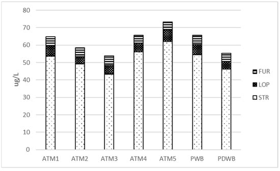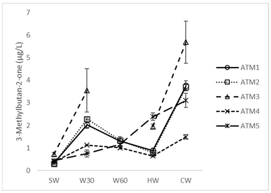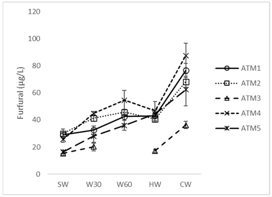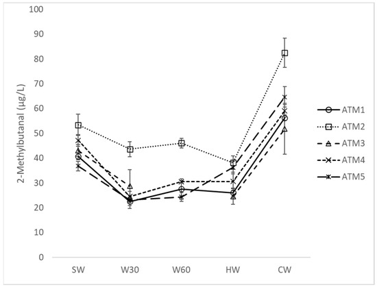 Comparing five samples prepared by the ATM system (Table 1), a similar trend in changes in concentration was observed for most of the monitored compounds (Table S2). During wort boiling, the concentration of acetaldehyde, acetone, 2-methylpropanal, 2-methylbutanal (Figure 1), 3-methylbutanal, hexanal, heptanal, benzaldehyde and phenylacetaldehyde decreased to a certain level or did not change if the starting concentration was similar to the final level. On the contrary, the concentration of furfural (Figure 2) increased continuously from SW to HW, with the lowest concentration in CW for ATM3 with a shorter boiling time and lower heat load according to TBA (Table 2). The unusual behavior of furfural is due to its significantly lower volatility and the different reaction mechanism of its formation by the Maillard reaction [10].