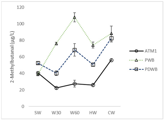 The equilibrium between newly formed and evaporated compounds was significantly altered in the pressurized systems. In the PWB system, the concentration of almost all compounds monitored increased up to 60 min of boiling. After pressure release (HW), the concentration decreased and changes in the whirlpool were inconclusive except for 2-methylbutanal (Table S2, Figure 4), 3-methylbutanal and heptanal. In the PDWB system, the concentration of carbonyls varied according to the pressure changes. Consequently, the changes in carbonyls during trub separation were similar to those in the ATM system. Compared to ATM1 with the same hop dosage, the concentrations of acetaldehyde, acetone, 2-methylpropanal, 3-methylbutan-2-one, 2-methylbutanal (Figure 4), 3-methylbutanal, hexanal, benzaldehyde and phenylacetaldehyde in CW were significantly higher for both pressurized systems. Similar results were obtained by Herrmann et al. [11], who found higher levels of benzaldehyde, phenylacetaldehyde, hexanal, heptanal and furfural in wort from the PDWB system than from the atmospheric system.