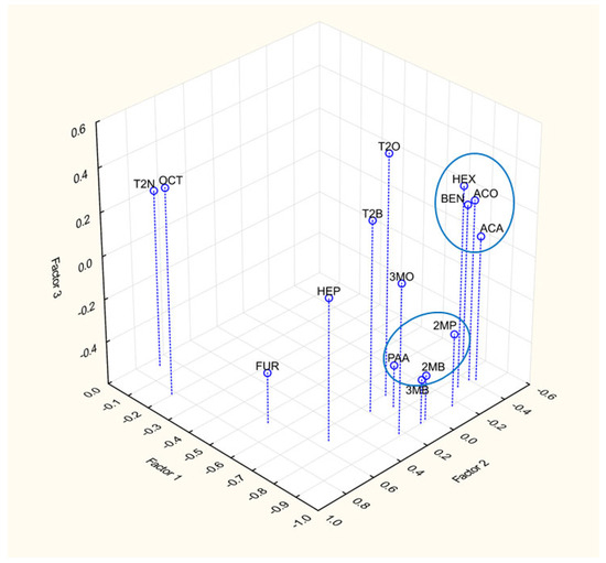 Graphical representation of the factor loadings for the first three factors from the factor analysis. Acetaldehyde (ACA), acetone (ACO), 2-methylpropanal (2MP), 3-methylbutan-2-one (3MO), 2-methylbutanal (2MB), 3-methylbutanal (3MB), trans-2-butenal (T2B), hexanal (HEX), heptanal (HEP), octanal (OCT), furfural (FUR), trans-2-octenal (T2O), trans-2-nonenal (T2N), benzaldehyde (BEN) and phenylacetaldehyde (PAA). Blue circles mark carbonyls with similar behavior.