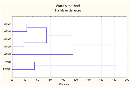 The overall view of the variability in the concentration profile of carbonyls depending on the wort boiling variant reflects the above-discussed differences in the content of individual substances. Cluster analysis of the set of mean values of individual carbonyls in CW showed a separation of the atmospheric and pressurized systems at the first level of the hierarchy (Figure 6). From the group of atmospheric boils, the variant with a short boiling time (ATM3) was closest to the pressurized system. The variants with hop pellets and hop extract (ATM1 and ATM4) show minor mutual differences.