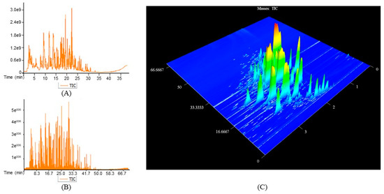 GC–TOF/MS and GC×GC–TOF/MS chromatograms of ST coffee beans. (A) Total ion flow chromatograms of ST from GC–TOF/MS. (B) Total ion flow chromatograms of ST from GC×GC–TOF/MS. (C) 3D image of ST from GC×GC–TOF/MS.