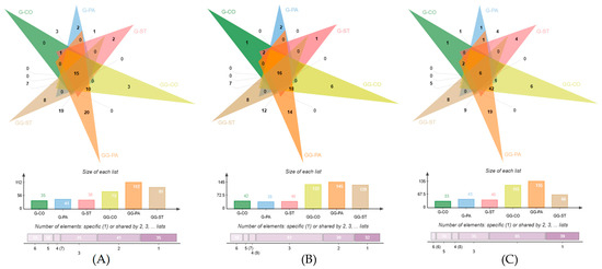 Venn diagrams of VOCs identified in three brands of coffee (CO, PA, ST) under three treatments. (A–C) Coffee bean, powder, and brew, respectively; G represents VOCs identified by GC–TOF/MS; GG represents VOCs identified by GC×GC–TOF/MS. The bottom of the column bar chart shows the number of VOCs identified in each coffee brand using G or GG. The stacked bar chart shows the number of VOCs shared among different brands that were identified using G or GG.