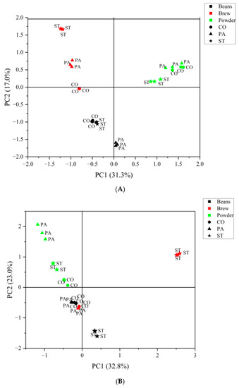 Product space based on PCA of VOCs identified from three brands of coffee (CO, PA, ST) under three treatments (bean, powder, and brew) using GC–TOF/MS (A) and GC×GC–TOF/MS (B). The black color represents bean, the red color represents brew, and the green color represents powder. Different shapes represent the brands: the circle for CO, the triangle for PA, and the star for ST.