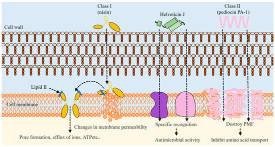 The classification parameters of bacteriocin mainly include molecular weight, mode of action, antibacterial activity, enzymatic stability, chemical structure, and the existence of modified amino acid residues after translation []. Bacteriocins can be divided into four categories according to their molecular weight, structure, mode of action, and function (Table 1) []. Class I bacteriocins are post-translational modified peptides that contain unusual amino acids such as lantibiotics and derivatives, and their molecular weight is usually lower than 5 kDa [,]. Nisin is produced by standard Lactococcus lactis (L. lactis), which is a typical example of a Class I bacteriocin, and was confirmed as GRAS by the FDA in 1988 []. Nisin is a widely studied and applied bacteriocin in the food industry, and is characterized by a wide spectrum of antibacterial activity against gram-positive bacteria []. It is widely used as a food additive in meat, dairy products, vegetables, and canned foods []. Class II bacteriocins comprise a very large group of heat-stable unmodified peptide bacteriocins, which can be further divided into four subgroups []. The class IIa bacteriocins are known as pediocin-like bacteriocins; this is currently the largest and most extensively studied subgroup of class II bacteriocins []. The class IIb bacteriocins, called dipeptide class II bacteriocins, are composed of two different individual peptides; about the same amount of each peptide is required to exert its best antimicrobial activity []. The class IIc bacteriocins, known as circular bacteriocins, are characterized by a peptide bond that links the N- and C-termini of the core peptide []. The class IId bacteriocins are single linear peptides []. Class III bacteriocins include heat-labile proteins, and their molecular weight is more than 10 kDa []. Helveticin J, Helveticin M, colicin, and enterolysin A are typical Class III bacteriocins, and were produced by Lactobacillus helveticin, Lactobacillus crispatus, E. coli, and Enterobacter faecalis, respectively []. It has been found that helveticus M can destroy the cell wall of gram-positive bacteria and the outer membrane of gram-negative bacteria, making it effective against both types []. Class IV bacteriocins are complex macromolecular compounds that include proteins, carbohydrates, or lipids. At present, these bacteriocins have not been purified [].