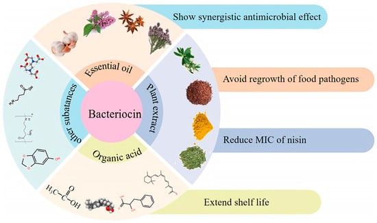 Due to enzyme degradation, poor solubility, uneven distribution in food, and partial inactivation through interaction with food components, the efficiency of bacteriocins is weakened when directly added to food systems []. Therefore, it is necessary to expand the antibacterial spectrum of bacteriocins, enhance their antibacterial effect, and avoid drug resistance. The synergistic antibacterial effect of bacteriocin and chemical substances has aroused widespread interest. Numerous studies have demonstrated a stronger antibacterial effect when bacteriocins are combined with chemical substances such as EOs, plant extracts, and OAs compared to when used alone (Figure 2).