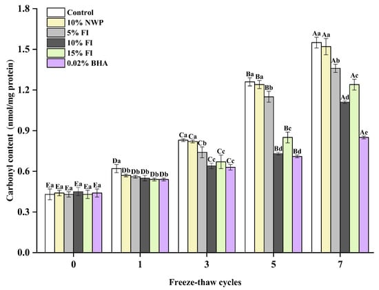 The variations in the carbonyl content of meat protein are an early marker of oxidative modification of proteins by a variety of amino acids. Certain amino acids, such as lysine, arginine, and proline, are easily converted to carbonyl groups during oxidation [26]. Therefore, evaluating the degree of oxidation in MP is often accomplished by measuring the change in carbonyl content. According to Figure 1, with the increasing F-T cycles, the carbonyl contents in each group showed an increasing trend and displayed a significant enhancement, especially after three cycles. It is evident that meat protein easily forms carbonyl compounds during the oxidation process, and the freezing process is crucial for the formation of protein carbonyl. This can be attributed to the disruption in the microstructure and integrity of muscle cells by the water recrystallization occurring during repeated F-T cycles. These physical changes in the muscle cells promote the release of pro-oxidants, thus exacerbating the protein oxidation and accelerating the formation of carbonyl groups [27]. Ice crystal growth also results in an increase in the concentration of solutes within the cell, which can further concentrate pro-oxidants and accelerate oxidative denaturation of proteins, thereby promoting the production of carbonyl groups [28]. What is more, the primary and secondary lipid peroxides (malondialdehyde) can probably interact with MP to generate carbonyl groups [29]. After seven F-T cycles, the control group exhibited the highest carbonylation level at 1.58 nmol/mg, which was substantially different from FI and BHA addition groups (p < 0.05). At the five and seven F-T cycles, the carbonyl contents of the 10% FI and 0.02% BHA groups were considerably lower than the other four groups (p < 0.05). These findings indicate different variations in protein oxidation among each group. This may be due to the high antioxidant activity of FI and BHA, which effectively inhibit protein oxidation by scavenging reactive oxygen radicals, inhibiting the production of lipid peroxides, as well as preventing the formation of carbonyl groups in MP. It is evident that the addition of FI to ground pork may impede the growth of ice crystals by interacting with MP, thereby mitigating freezing denaturation-induced protein damage and delaying protein oxidation and carbonyl production in the pork, with the best effect of 10% FI.