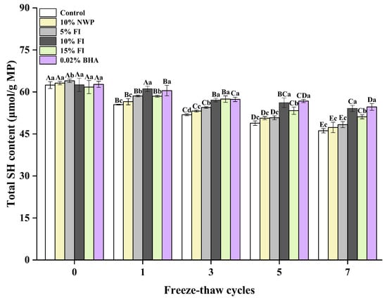 The SH group on protein side chains is one of the most active functional groups [13], easily oxidized through dehydrogenation, leading to the formation of disulfide linkages (S-Ss) and subsequently decreasing protein stability [30]. Changes in sulfhydryl groups are imperative for describing how proteins fold, S-Ss form, and proteins are arranged in a particular sample, which in turn are closely linked to oxidation. Therefore, the total SH content is commonly used as a vital indicator for determining the oxidative denaturation of proteins [31]. Figure 2 illustrates that the control group’s total SH content was initially 62.45 nmol/mg, which gradually decreased with each additional F-T cycle, reaching its lowest level of 46.16 nmol/mg after seven F-T cycles. This could be attributed to the sensitivity of sulfhydryl groups in meat protein towards F-T cycles, which results in the formation of intramolecular or intermolecular disulfide linkages [32]. MP is abundant in SH groups, which are easily changed to S-Ss during the oxidative process. According to Wang et al. [30], the formation of disulfide linkages can promote protein aggregation and disrupt protein conformation and spatial structure. Notably, in comparison to the control group, FI groups had a greater total SH content in each F-T cycle. In particular, the total SH content in the 10% FI group only decreased by 8.42% after seven F-T cycles. This may be because FI overlaps with the SH group of the actomyosin molecule, resulting in a decline in oxidation sensitivity to the SH group, thereby effectively delaying the conversion of SH groups to disulfide linkages and stabilizing the protein structure. Additionally, FI contains strong antioxidant active substances that interact with proteins, effectively inhibiting the generation of disulfide linkages and preventing the aggregation of proteins. Furthermore, there was no discernible difference in the total SH content between 10% FI and 0.02% BHA groups throughout the F-T cycles (p > 0.05), with comparable effects. This indicates that FI has the potential to replace synthetic antioxidants, and it has a positive effect on delaying protein oxidation and improving the oxidative stability of ground pork in multiple F-T cycles.