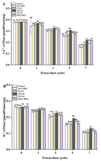 Changes in the myofibrillar protein of Ca2+-ATPase (A) and K+-ATPase (B) with different fraction I (FI) contents in ground pork during repeated freeze–thaw (F-T) cycles. Significant differences between 0, 1, 3, 5, and 7 F-T cycles are indicated with different capital letters (A–E). Significant differences among different samples are indicated by different lowercase letters (a–d). FI: 4-h whey protein hydrolysate with the best antioxidant activity (<1 kDa).