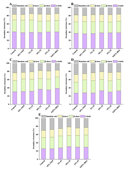 Changes in the myofibrillar protein of secondary structure with different fraction I (FI) contents in ground pork during repeated freeze–thaw (F-T) cycles. (A–E) denotes 0, 1, 3, 5, and 7 F-T cycles. FI: 4-h whey protein hydrolysate with the best antioxidant activity (<1 kDa).