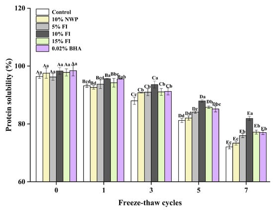 Changes in the myofibrillar protein of solubility with different fraction I (FI) contents in ground pork during repeated freeze–thaw (F-T) cycles. Significant differences between 0, 1, 3, 5, and 7 F-T cycles are indicated with different capital letters (A–E). Significant differences among different samples are indicated by different lowercase letters (a–d). FI: 4-h whey protein hydrolysate with the best antioxidant activity (<1 kDa).