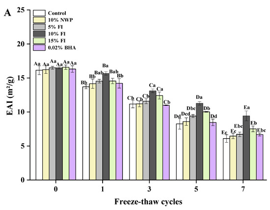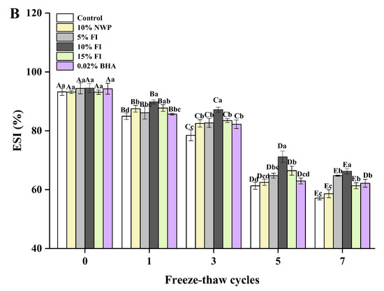 The oil and water retention of meat products is greatly affected by the emulsification properties of proteins, which has an impact on the yield and quality of the product. Protein emulsification properties are commonly evaluated using the EAI and ESI [49]. EAI represents the capacity of the protein to stay at the oil–water interface to prevent flocculation and aggregation following emulsion formation, which reflects the complex interactions between protein–protein and protein–lipid [50,51]. As illustrated in Figure 6A, the EAI of the six groups gradually decreased as the F-T cycles increased. In particular, a considerable decline was seen after three F-T cycles. The cycles of freezing and thawing promote protein denaturation, increasing the protein particle size, which is a key factor contributing to the reduction in EAI. Moreover, protein aggregation may produce larger proteins, increasing the space between the water and oil in the emulsion, thereby reducing the potential of protein molecules to adsorb to the oil–water interface [52]. The control group exhibited the most significant decline in EAI after seven F-T cycles, with a decrease of 10.04%, which may be due to the fact that the proteins produced by oxidation are too huge to remain flexible when adsorbed to the oil droplet’s surface. In the study conducted by Marwan et al. [53], the solubility and emulsifying ability of sarcoplasmic proteins were significantly decreased due to the oxidation products generated during protein storage. However, FI effectively prevented the decrease in EAI, in which the addition of 10% FI had the best effect with only a 7.07% decrease. The above results demonstrate that FI maintains the protein structure during the F-T cycle, which would promote protein adsorption on the interfacial layer and positively affect the emulsification properties of the protein.