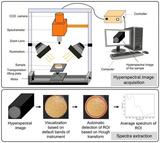After correction, the spectra of each sample were extracted by utilizing the default band parameters of the instrument (1453.51 nm, 1246.54 nm, 1123.34 nm) as the RGB channels for hyperspectral image visualization, followed by the application of the Hough transform for sample position detection. This computer vision technique, commonly used for object detection in images, works by transforming the image into a parameter space to identify peaks corresponding to the presence of a particular shape. The detected position information was then utilized to automatically delineate the region of interest (ROI) for each sample. Finally, the sample’s spectral information was extracted by averaging the data within the ROI. The process of spectra extraction is illustrated in Figure 1.