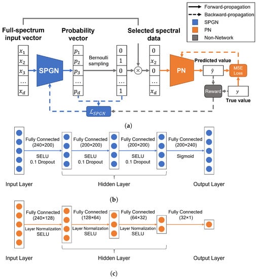 where represents the score on the validation set, denotes a baseline score that serves as a reference point for comparison, and is a scaling factor employed to adjust the score to a suitable range. The reward can be either positive or negative, depending on the performance of the PN after training with the selected spectral data . A positive reward indicates that is a good selection result, as it leads to favorable prediction performance on the training set. In contrast, a negative reward implies that the selection result may not be suitable and should be avoided for future iterations. Then, the SPGN can perform one iteration of training according to the reward.