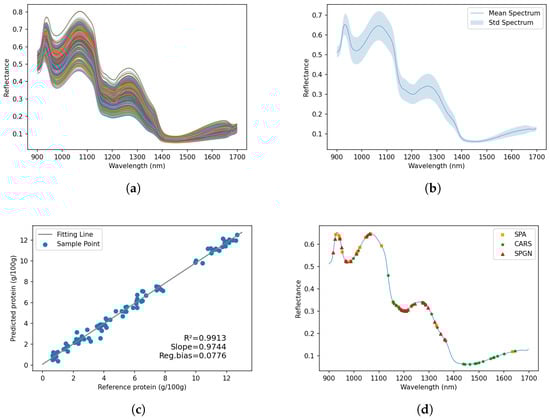 Spectral characterization for the dataset and the visualization of experiment results. (a) Reflectance spectra of all samples. (b) Mean spectrum and standard deviation of the spectral data. The blue line shows the mean spectrum, while the shaded area represents the standard deviation of the reflectance values at each wavelength. (c) Reference versus predicted values for protein content from OptmWave. (d) Visualization of effective wavelength selection result by SPA, CARS, and our proposed SPGN.