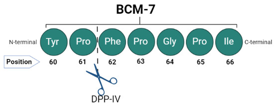 In humans, casein digestion starts in the stomach, where enzymes hydrolyze peptides of various lengths, continues in the duodenum, and, finally, proceeds to jejunal digestion, where hydrolysis and the absorption of smaller peptides occurs [10]. For the absorption of proteins in the intestine, it is necessary that these proteins break into amino acids or small peptides, for example, dipeptides and tripeptides [6]. Physiologically, dipeptidyl peptidase IV (DPP-IV) is the main enzyme responsible for the hydrolysis of dipeptides into free amino acids [36], a cell surface enzyme present in various types of cells, such as endothelial cells and brush border in the intestinal mucosa, in various intestinal bacteria strains, which are present in the soluble form in the bloodstream [2,37]. In fact, DPP-IV is considered the main enzyme responsible for the cleavage of BCM-7, as it selectively removes the dipeptide that contains proline (Pro61) in N-terminal peptides [16] (Figure 2). Therefore, the study of this interaction is essential.
