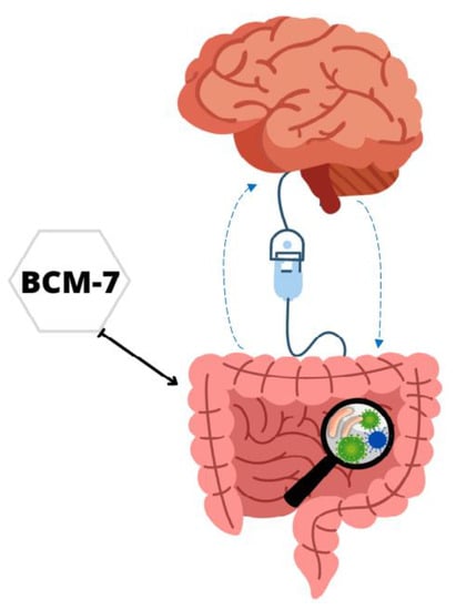 Potential interaction of BCM-7 in the microbiota–gut–brain axis.