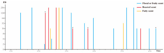 Flavor dilution chromatograms of the aroma-active regions identified in DDT. Different colors indicate the different aroma types. The symbol “*” indicates the compounds are unidentified in GC-O-MS and are subject to further identification using GC × GC-TOF-MS.