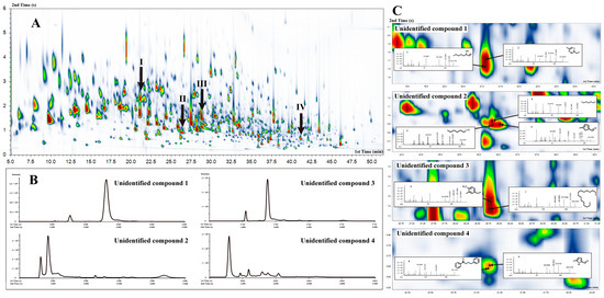 In the GC × GC-TOF-MS chromatogram, it was evident that multiple compounds experienced co-elution in the first dimension GC, making their accurate identification challenging. However, the introduction of a second column significantly improved the identification process. As shown in Figure 3B, four unidentified compounds were efficiently separated in this two-dimensional system.