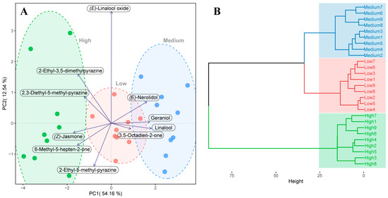 Principal component analysis and PCA loading plot (A) and hierarchical cluster analysis (B) of the 10 key aroma compounds with OAV > 1 across all DDT samples with three grades, including high grades, medium grades, and low grades.