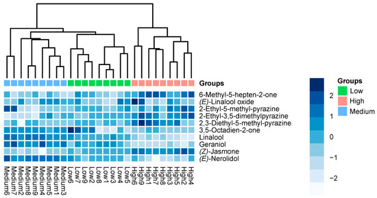 According to the actual content of the 10 key aroma compounds presented in DDT tea infusions, comparative analyses of these compounds among different grades of DDT were conducted using PCA and HCA (Figure 5). The PCA score plot demonstrated an accumulated explanatory variance of 66.70% for the first two principal components, which was enough to explain the information regarding the key aroma compounds across all DDT samples. It is clearly demonstrated that all samples were divided into three different clusters, consistent with their respective grades. The PCA loadings of the 10 compounds were further plotted to pinpoint characteristic key aroma compounds unique to each DDT grade (Figure 5A). Notably, the compounds located on the left, namely 2-ethyl-3,5-dimethylpyrazine, 6-methyl-5-hepten-2-one, (Z)-jasmone, 2,3-diethyl-5-methylpyrazine, and 2-ethyl-5-methylpyrazine, were the most significant contributors to the separation of high-grade DDT samples from other samples. Conversely, the compounds located on the right, i.e., (E)-nerolidol, linalool, geraniol, and 3,5-octadien-2-one, represented the characteristic key aroma compounds of the medium-grade samples. Next, HCA was conducted to visualize the overall comparison of the key aroma compound profiles (Figure 5B). The dendrograms revealed a clear clustering pattern consistent with their respective grades. The results from both PCA and HCA indicated observable differences in the key aroma compounds among the different grades of DDT. Furthermore, a heatmap plot was employed to provide a visual and comprehensive comparison of the compounds based on their content, as reflected in Figure 6. Notably, five compounds, i.e., 2-ethyl-5-methylpyrazine, 6-methyl-5-hepten-2-one, 2-ethyl-3,5-dimethylpyrazine, (Z)-jasmone, and 2,3-diethyl-5-methylpyrazine, were significantly more abundant in high-grade samples. On the other hand, four compounds, i.e., 3,5-octadien-2-one, (E)-nerolidol, geraniol, and linalool, were significantly more abundant in medium-grade samples.