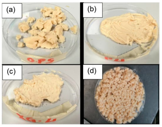 The buffer solution and glycerol were first blended together using a food processor (10 oz capacity,150 Watts) and then the polysaccharides were added [34,35]. This mixture was then stirred for three minutes to disperse the polysaccharides evenly throughout the liquid mixture. Powdered SPI was then introduced into this mixture and the system was blended for a further two minutes. The samples containing high pectin concentrations (2 and 4 wt.%) required extra time for complete dissolution and so the SPI was added after two hours of mixing for these systems. After mixing, these formulations had textures that varied from viscous pastes to soft agglomerated solids (Figure 1).