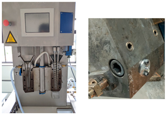 The extruder barrel had three heating zones with the die being at the same temperature as the last heating zone. The screws were conical, tapering at the die end with reducing channel depth along the length. Following the screw rotation region was a curved melt flow path of 40 mm length and 3 mm diameter at the end of the barrel, which led the melt to the exit of the die. An image of the extruder with a fitted die is shown in Figure 2.